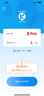 HOME > お買い物 > お買い物 食 ジハンピ 2025/09/16(火) 09:24 2025/10/08(水) 20:57 昨日妻から聞いて、慌ててインストール&設定。無事、ドリンク3本無料ゲットです。 セットアップ方法はここのページが一番わかりやすかったです。 平凡家庭の資産形成ジュース3本無料で貰えるアプリ「ジハンピ」の初回登録方法を解説【サントリー自販機キャッシュレスアプリ】https://ordinaryfamily-assetformation.com/suntory-jihanpi-how-to-register/サントリーの公式アプリ「ジハンピ」は簡単な登録をするだけで好きな飲み物が3本無料で貰えます。私もさっそく利用してみましたので、今回の記事では「ジハンピ」アプリの紹介と初回登録方法、そしてアプリで実際に飲み物を購入する方法までを解説いたします。 www.suntory.co.jpAccess Deniedhttps://www.suntory.co.jp/softdrink/jihanki/jihanpi/ -お買い物, 食 Twitter Facebook Google+ Pocket B!はてブ LINE